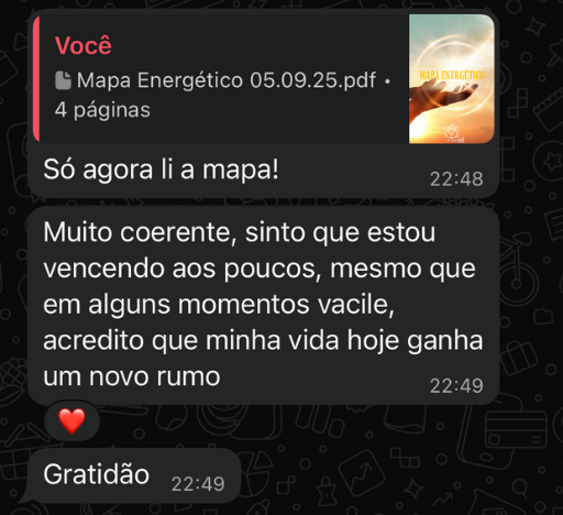Arquivo em PDF contendo o seu mapeamento detalhado em Hertz e o registro de todas as orientações e aconselhamentos estratégicos alinhados durante a avaliação. Um guia prático para direcionar seus próximos passos e decisões com total clareza.